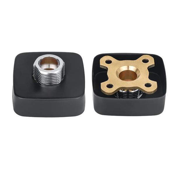 Musta neliön muotoinen suihkuhanalevy. Sen ydintarkoituksena on tarjota tukeva, tasainen ja helposti asennettava alusta seinään asennetuille hanoille. Tuotteessa on messingin ja hiiliteräksen komposiittirakenne: avainvoima- ja liitososat, jotka ovat suorassa kosketuksessa seinään ja hanojen rajapintaan, käyttävät messinkiä varmistaakseen liitoksen pitkäaikaisen korroosionkestävyyden ja tiiviyden; Päätukirakenteena levyrunko on valmistettu erittäin lujasta hiiliteräksestä, joka tarjoaa tarvittavan tukijäykkyyden kokonaisuudelle ja estää pitkäaikaisen jännityksen aiheuttaman muodonmuutoksen. Levyrungon pinta on käsitelty galvanoimalla ja muilla prosesseilla, jolloin ulkonäkö on kultainen ja helppo puhdistaa. Se on suunniteltu vakioneliöksi, jossa on esiasetettu asennusreikä, joka sopii yhteen yleisten hanojen lisävarusteiden kanssa ja yksinkertaistaa asennusta.