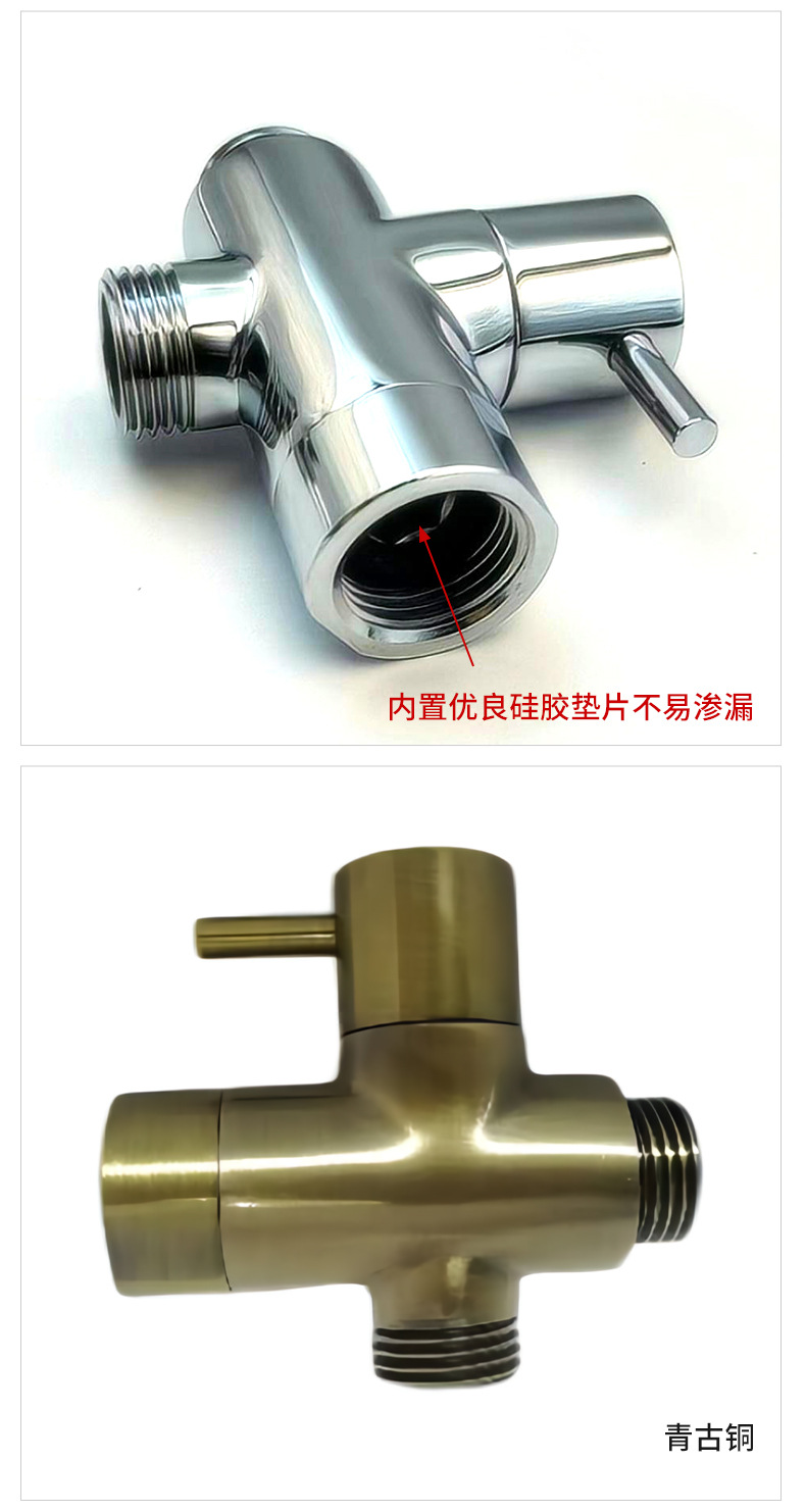 Sen ydintarkoituksena on tarjota monikäyttöinen, tiivis ja helposti asennettava integroitu ratkaisu kylpyhuoneen suihkujärjestelmiin, joka yhdistää veden ohjauksen, virtauksen säädön ja kädessä pidettävän suihkun pidikkeen toiminnot yhdeksi kompaktiksi malliksi. Tuotteessa on erittäin puhdas kiinteä messinkirakenne: vesiväylät, kierreliitokset, venttiilin ydin ja kantavat osat, jotka ovat suoraan kosketuksissa veden ja seinän kanssa, on valmistettu korkealaatuisesta messingistä, jotta varmistetaan pitkäaikainen korroosionkestävyys, ruosteenesto, nolla vesivuoto ja vakaa toiminta. Tuotteen pinta on käsitelty kromipinnoitus- ja kiillotusprosesseilla, mikä näyttää kirkkaalta peilimäiseltä kromista, likaantumista estävältä, sormenjälkiä kestävältä ja helposti puhdistettavalta.